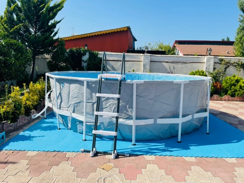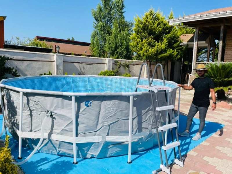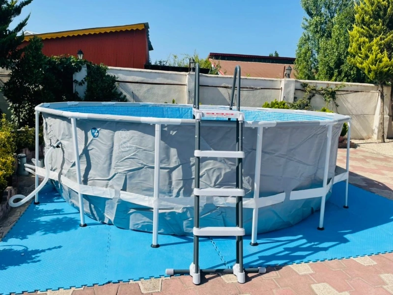 استخر پیش ساخته خانوادگی دایره 457*122 اینتکس با رنگ طوسی روشن و ساختاری با دوام و طرح کاشی کاری داخلی، علاوه بر داشتن ظاهری زیبا و آراسته، مجهز به نردبان ایمنی و روکش و زیرانداز و از همه مهمتر پمپ تصفیه آب می باشد. استفاده به عنوان استخر شنا و تفریحات آبی، پرورش ماهی و توسعه ی کسب و کارهای مرتبط، صنایع کشاورزی برای ذخیره آب و آب درمانی بخشی از کاربردهای گسترده این استخر می باشد.