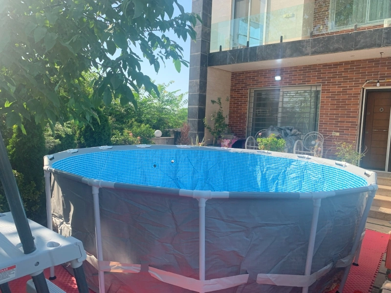 جنس بدنه: ساخته شده از PVC ضخیم سه لایه با الیاف ابریشم، که تضمینکننده مقاومت و طول عمر بالای استخر است. لایه داخلی و خارجی از PVC مقاوم و لایه میانی از الیاف پلی استر با تار و پودی برای افزایش استحکام است.
